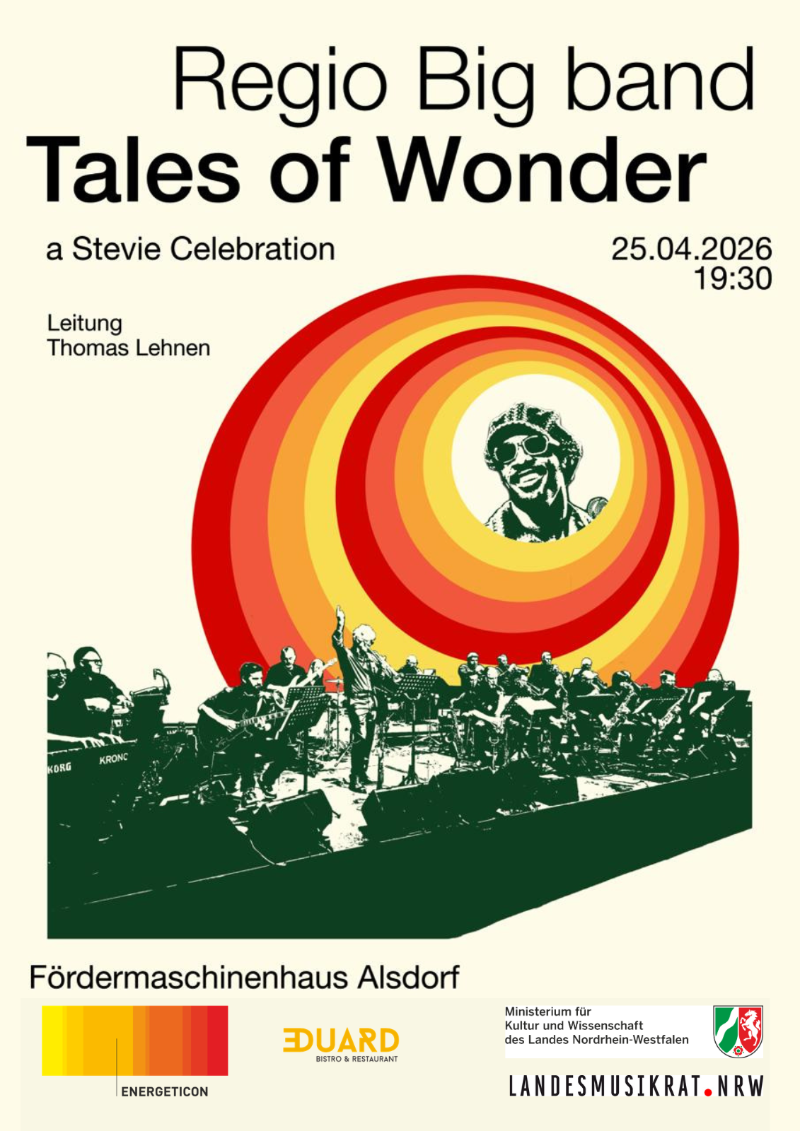 Am Samstag, den 25.04.2026, lädt die Regio Big Band herzlich zu ihrem diesjährigen Frühlingskonzert unter dem Motto „Tales of Wonder“ ein. In der besonderen Kulisse des Fördermaschinenhauses im Energeticon Alsdorf präsentieren wir – nicht ausschließlich, aber hauptsächlich – Interpretationen des Ausnahmekünstlers Stevie Wonder.
