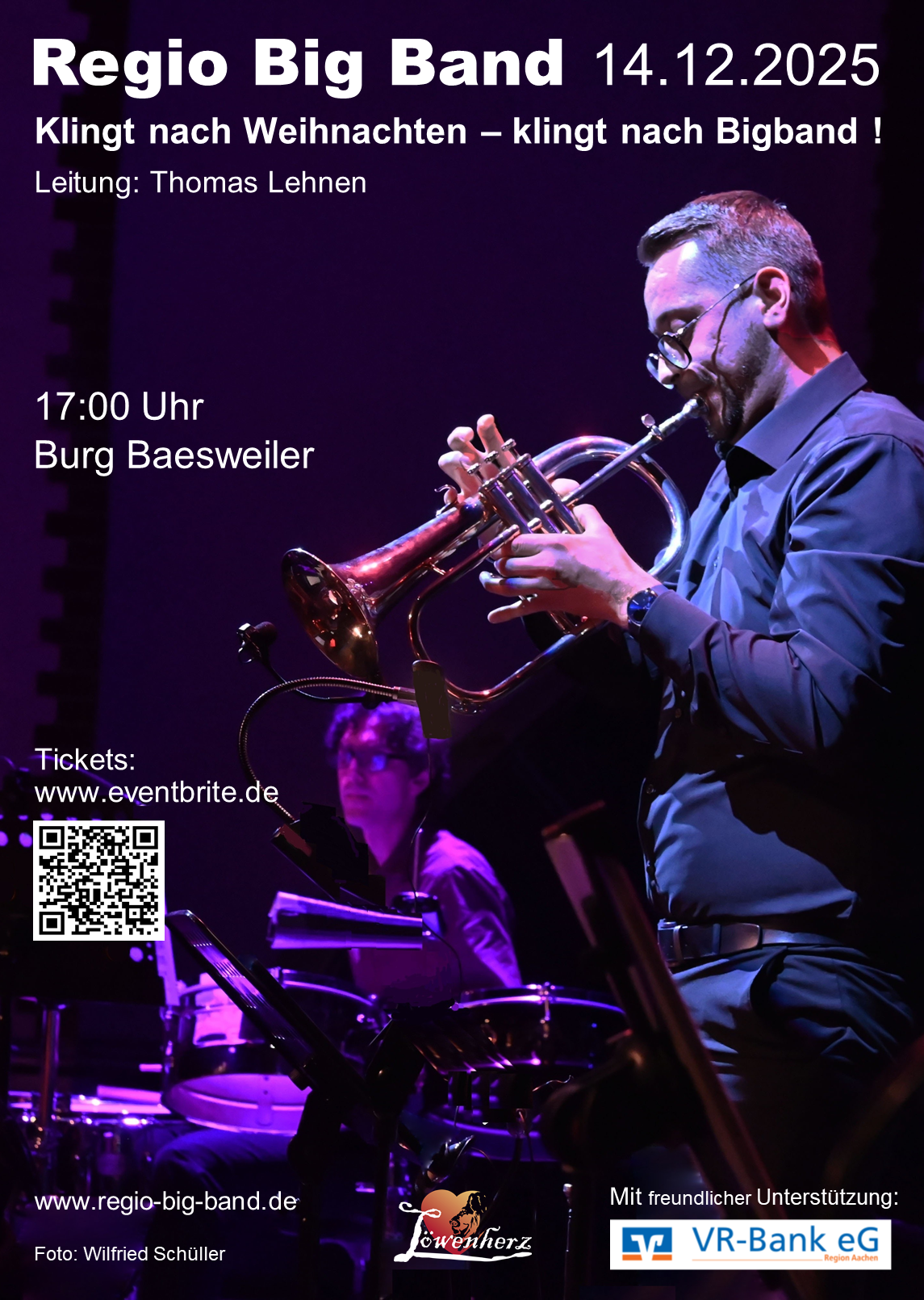 Am 14.12.2025 um 17:00 Uhr veranstalten wir in der Burg Baesweiler unser diesjähriges Weihnachtskonzert. Unter dem Motto „Klingt nach Weihnachten – klingt nach Bigband!“ präsentieren wir echte Weihnachtsklassiker mit echtem Big Band Sound. Unter der Leitung von Thomas Lehnen stimmen wir euch mit unserem ca. zweistündigen Programm auf den Endspurt der Vorweihnachtszeit ein.